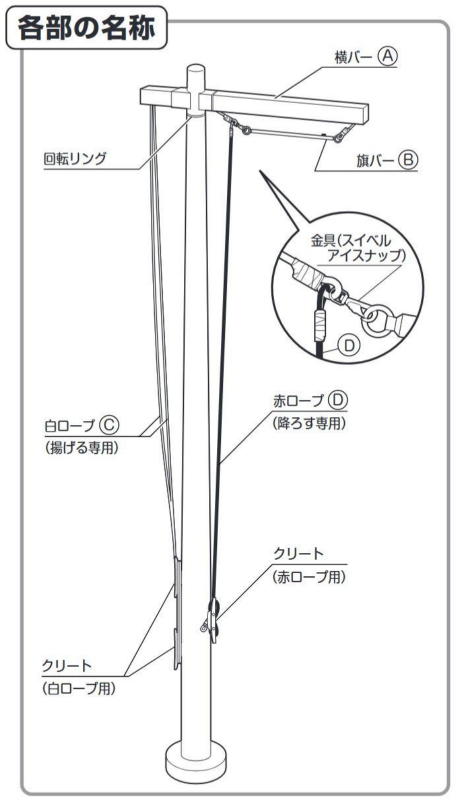 白ロープ(C)が旗バー(B)に固定され、のぼり旗を