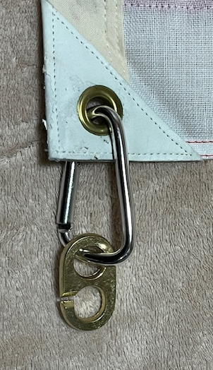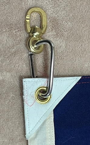 4:スイブル・フックは各々取り付け用の切れ込みがありますので、はめ合わせワンタッチ取り付けが可能です。このため、旗、ロープ共スイブル・フック金具を取り付けていればいちいち縛る必要が無く、取り付け、取り外しが容易に行えます。